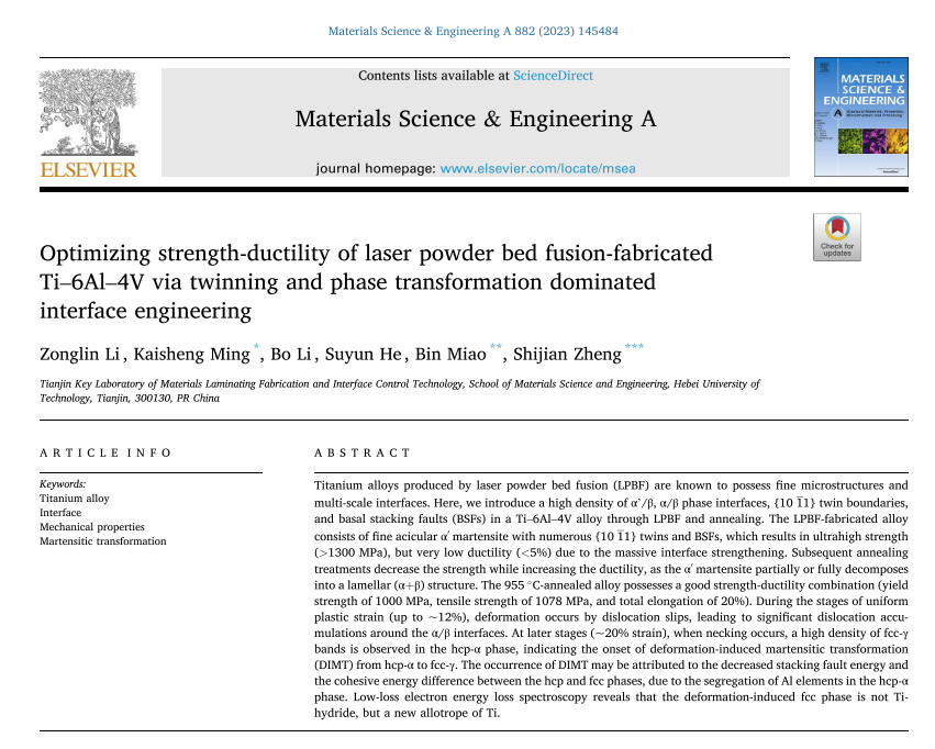 Optimizing strength-ductility of laser powder bed fusion-fabricated Ti–6Al–4V via twinning and phase transformation dominated interface engineering Materials Science & Engineering A 2023