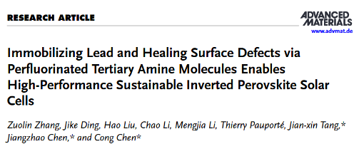 Immobilizing Lead and Healing Surface Defects via Perfluorinated Tertiary Amine Molecules Enables High-Performance Sustainable Inverted Perovskite Solar Cells,Adv. Mater.,2025,37,2508126.