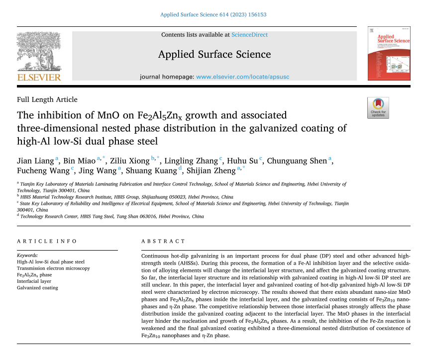 The inhibition of MnO on Fe2Al5Znx growth and associated three-dimensional nested phase distribution in the galvanized coating of high-Al low-Si dual phase steel Applied Surface Science 2023