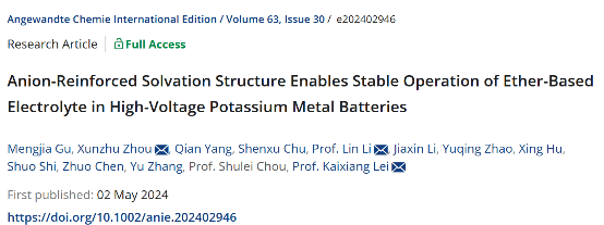 Anion-Reinforced Solvation Structure Enables Stable Operation of Ether-Based Electrolyte in High-Voltage Potassium Metal Batteries,Angew. Chem. Int. Ed.,2024.07.22.