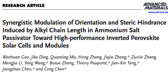 Synergistic Modulation of Orientation and Steric Hindrance Induced by Alkyl Chain Length in Ammonium Salt Passivator Toward High-performance Inverted Perovskite Solar Cells and Modules,Adv. Mater.,2024,37,2413304.