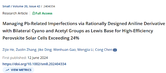 Managing Pb-Related Imperfections via Rationally Designed Aniline Derivative with Bilateral Cyano and Acetyl Groups as Lewis Base for High-Efficiency Perovskite Solar Cells Exceeding 24%,Small,2024,20,2404334.