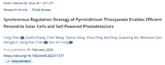 Synchronous Regulation Strategy of Pyrrolidinium Thiocyanate Enables Efficient Perovskite Solar Cells and Self-Powered Photodetectors,Small,2024,20,2311377.
