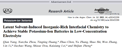 Latent Solvent-Induced Inorganic-Rich Interfacial Chemistry to Achieve Stable Potassium-Ion Batteries in Low-Concentration Electrolyte,Angew. Chem. Int. Ed.,2025.03.17.