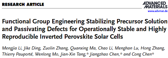 Functional Group Engineering Stabilizing Precursor Solution and Passivating Defects for Operationally Stable and Highly Reproducible Inverted Perovskite Solar Cells,Adv. Mater.,2025,37,2502729.