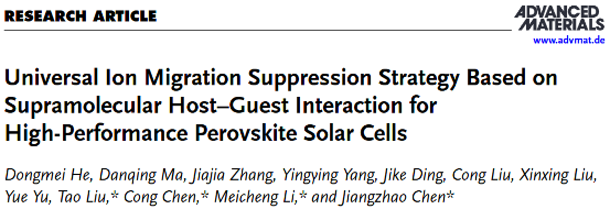 Universal Ion Migration Suppression Strategy Based on Supramolecular Host–Guest Interaction for High-Performance Perovskite Solar Cells,Adv. Mater.,2025,n/a,2505115.