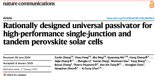 Rationally designed universal passivator for high-performance single-junction and tandem perovskite solar cells,Nat. Commun.,2025,16,753.
