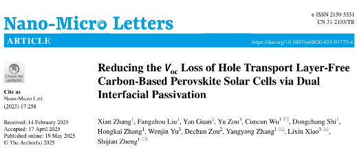Reducing the Voc Loss of Hole Transport Layer Free Carbon Based Perovskite Solar Cells via Dual Interfacial Passivation,Nano-Micro Lett.,2025.
