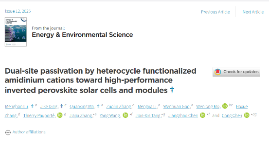 Dual-site passivation by heterocycle functionalized amidinium cations toward high-performance inverted perovskite solar cells and modules,Energy Environ. Sci.,2025,18,5973-5984.